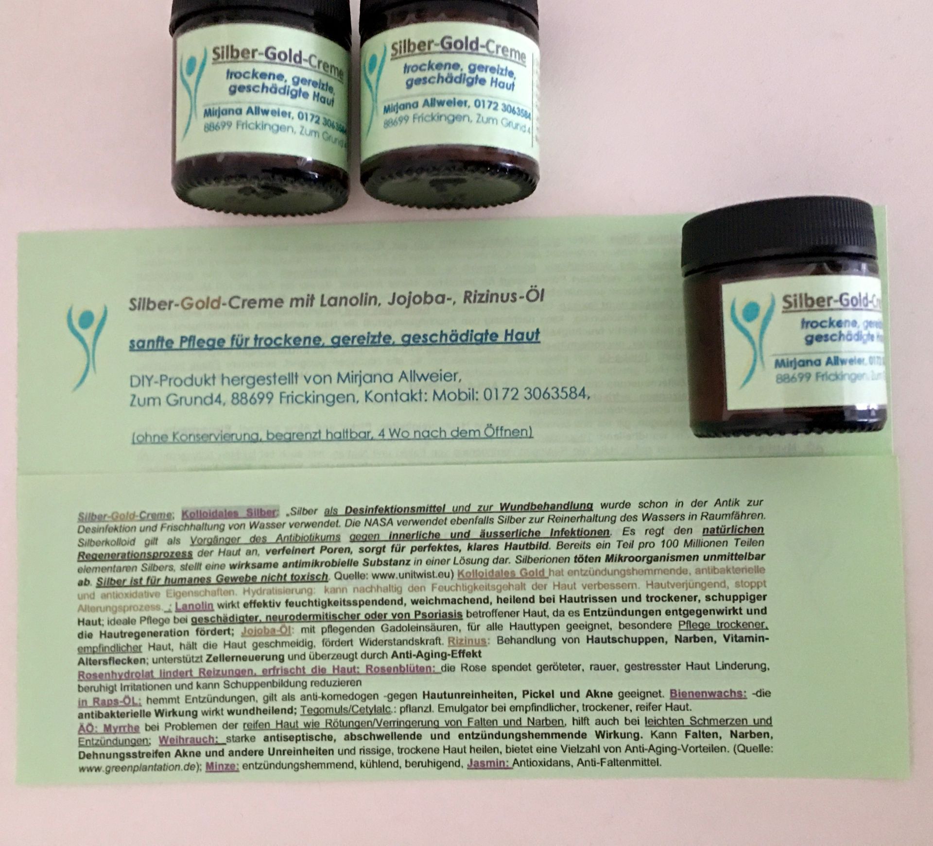 Kolloidales Silber: „Silber als Desinfektionsmittel und zur Wundbehandlung wurde schon in der Antik zur Desinfektion und Frischhaltung von Wasser verwendet. Die NASA verwendet ebenfalls Silber zur Reinerhaltung des Wassers in Raumfähren. Silberkolloid gilt als Vorgänger des Antibiotikums gegen innerliche und äusserliche Infektionen. Es regt den natürlichen Regenerationsprozess der Haut an, verfeinert Poren, sorgt für perfektes, klares Hautbild. Bereits ein Teil pro 100 Millionen Teilen elementaren Silbers, stellt eine wirksame antimikrobielle Substanz in einer Lösung dar. Silberionen töten Mikroorganismen unmittelbar ab. Silber ist für humanes Gewebe nicht toxisch. Quelle: www.unitwist.eu)